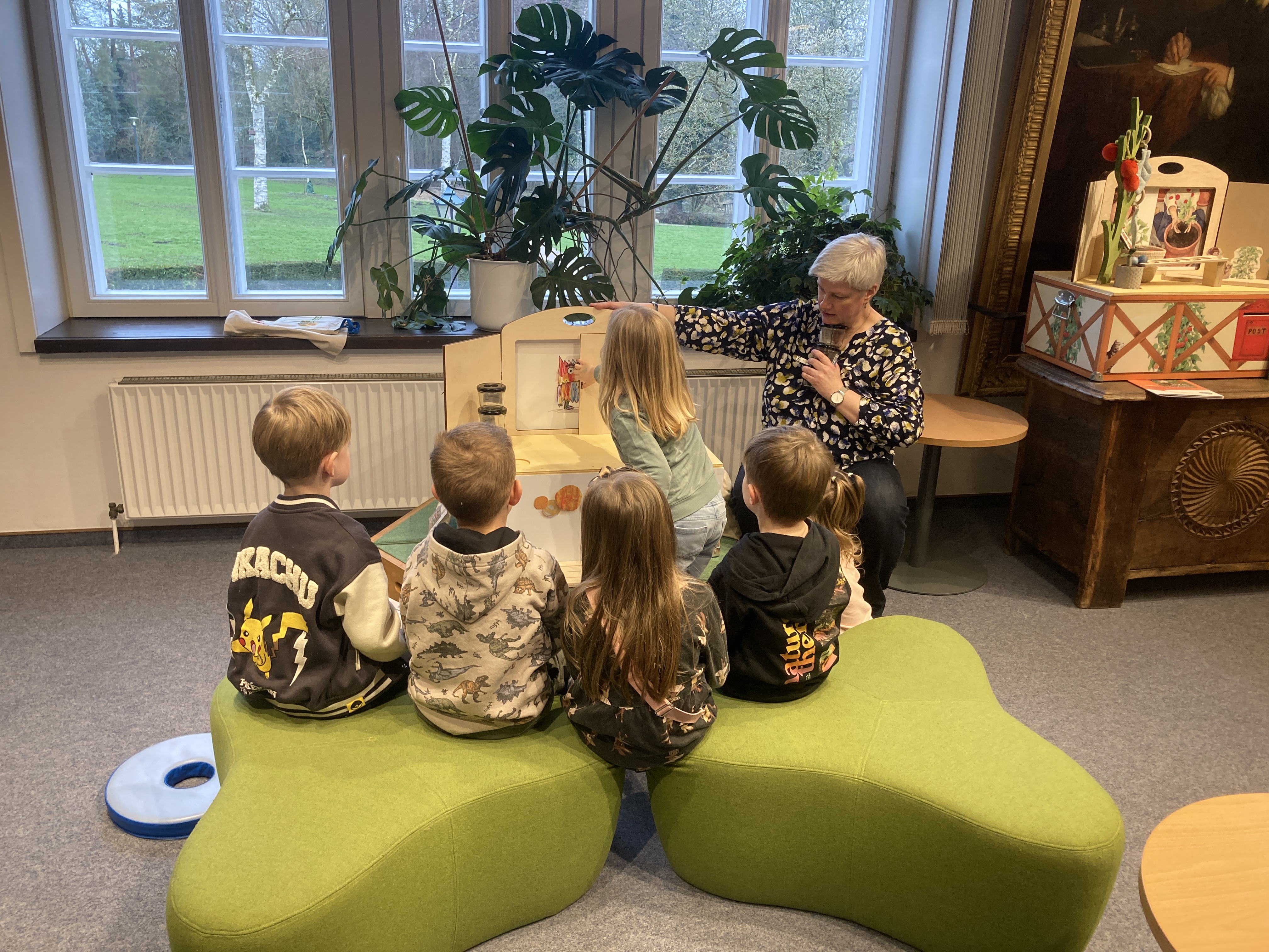 Pressefoto: Die Zwergengruppe der Kita Rappelkiste entdeckt gemeinsam mit Büchereileiterin Almut vom Lehn die Plapperkiste „Das Farbenmonster“.
